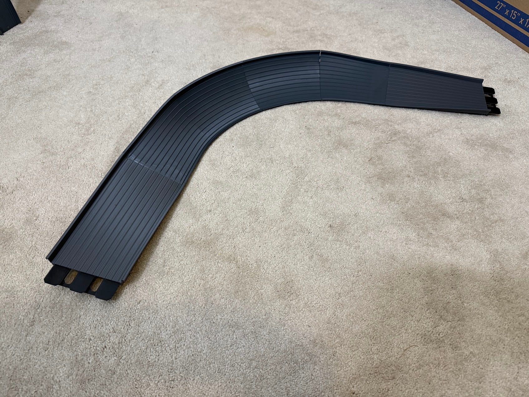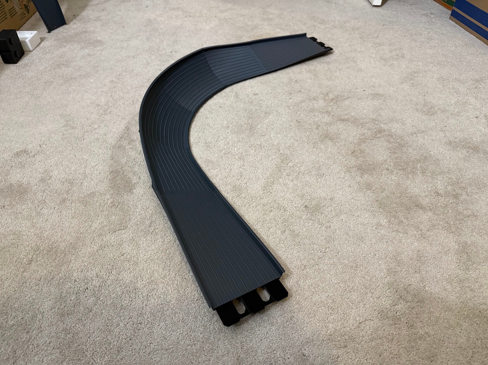 A 3 Lane width Open 90° turn. Comes in Grey with black connectors.